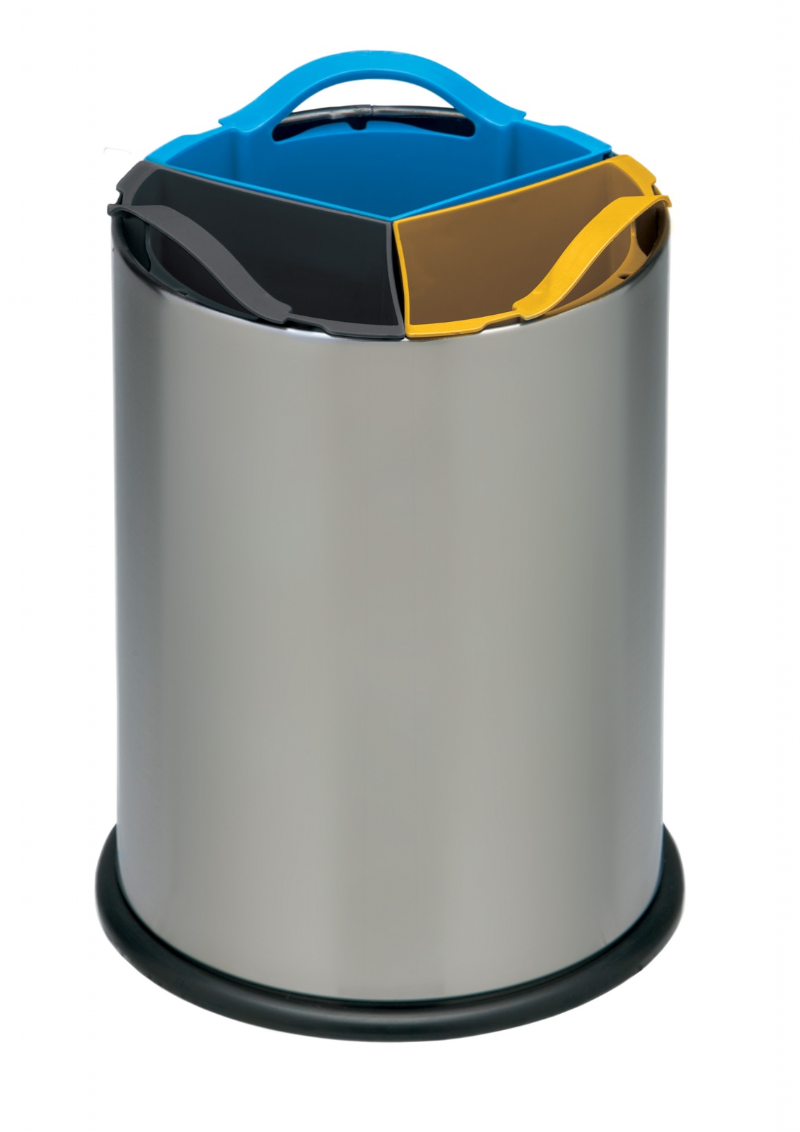 Cestino gettacarte TRIS  realizzato in acciaio inox satinato e 3 vaschette integrate per la raccolta differenziata .